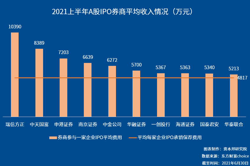 2021年上半年平均每家企业IPO上市所需承销保荐费用为4817万元。保荐机构平均担任一家企业IPO保荐工作费用最高的是瑞信方正,为10390万元,不过瑞信方正今年上半年就只参与了华康股份(605077.SH)这一家的承销保荐工作。排名第二的是中天国富,为8389万元,排名第三的是申港证券,为7203万元。