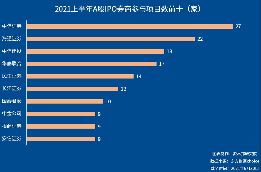 具体来看,中信参与的项目数名列前茅,共担任27家企业承销保荐工作,其次是海通证券,为22家,中信建投排在第三,为18家。