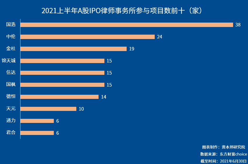 从上半年IPO法律顾问业绩来看,国浩最为突出,共为38家企业IPO上市担任法律顾问。其次是中伦,为24家,排名第三的是金杜,为19家。