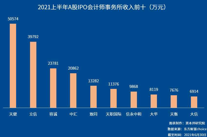 2021年上半年,天健会计师事务所参与IPO审计验资工作共获得5.06亿元收入,排名第一。排在第二的是立信会计师事务所,共获得收入3.98亿元,排名第三的是容诚会计师事务所,为2.38亿元。