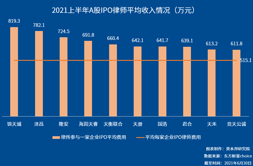 2021年上半年律师事务所平均每参加一项IPO获得收入为515.1万。而其中平均参与一家企业IPO所获收入最高的是上海锦天城,为819.3万元,排名第二的是泽昌,为782.1万元,其次排在第三的是隆安,为724.5万元。