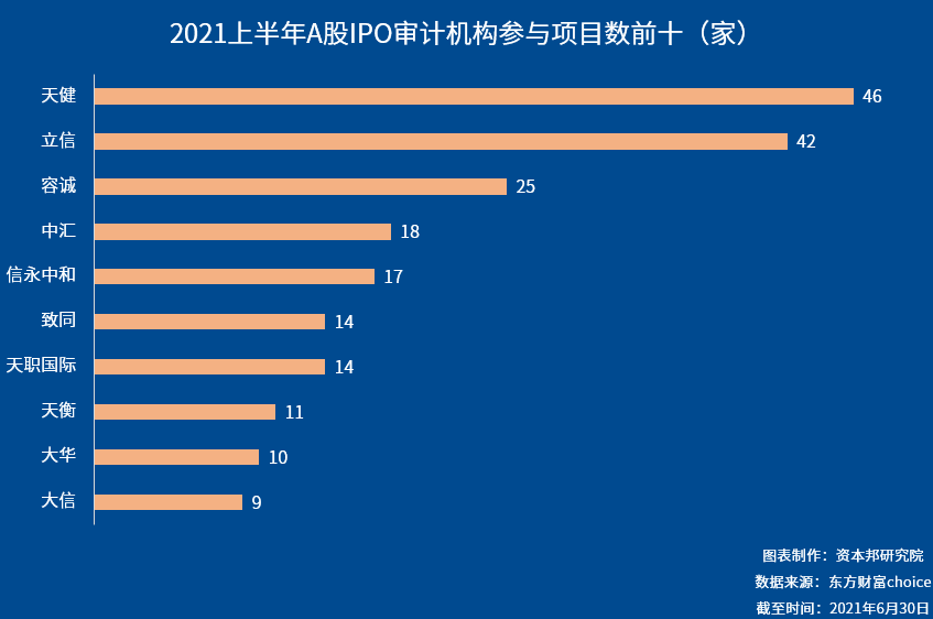 从审计机构来看,今年上半年天健会计师事务所为第一,为46家企业IPO上市担任审计验资服务。其次是立信会计师事务所,为42家。