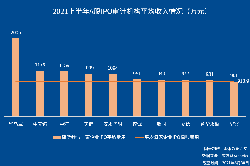 2021年上半年,会计师事务所每担任一家企业的IPO的审计验资工作,平均获得913.9万元收入。其中每单IPO审计项目收入最高的会计师事务所是毕马威华振会计师事务所,为2005万,不过毕马威只担任了一家企业的IPO审计验资工作。排名第二的是中天运会计师事务所,为1176万,排名第三的是中汇会计师事务所,为1159万元。
