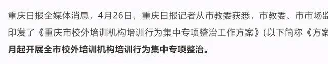 4月,重庆开启校外培训机构培训行为集中专项整治,主要围绕违法违规举办校外培训机构、培训与招生入学挂钩、中小学校及在职教师组织或者参与培训行为、开展校外培训机构超前超纲培训和侵害消费者权益行为。
