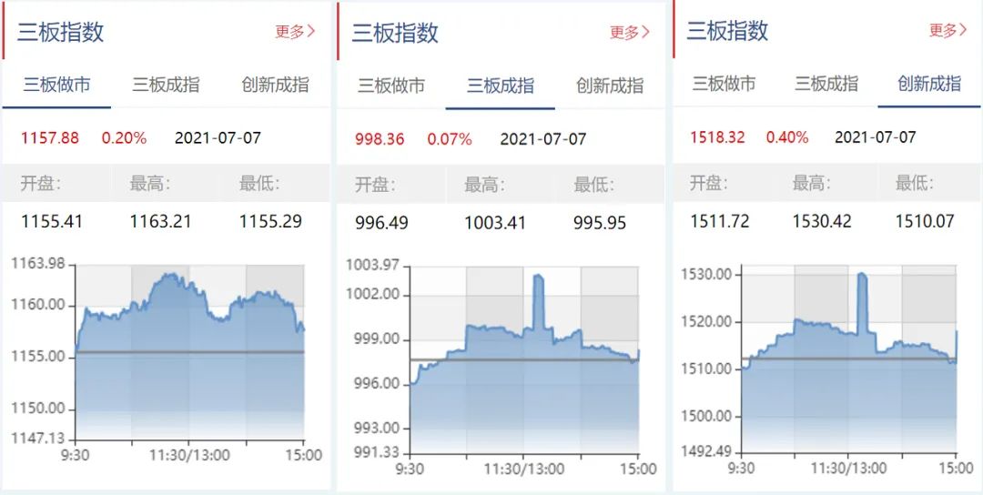 截至7月6日收盘,三板做市报1157.88点,上涨0.20%;三板成指报998.36点,上涨0.07%;三板创新报1518.32点,上涨0.40%。