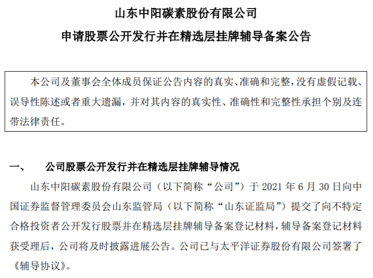 公告显示,中阳股份于2021年6月30日向山东证监局提交了向不特定合格投资者公开发行股票并在精选层挂牌辅导备案登记材料,辅导备案登记材料获受理后,公司将及时披露进展公告。公司已与太平洋证券股份有限公司签署了《辅导协议》。