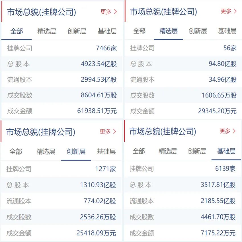 新三板挂牌公司总计7466家(精选层56家,创新层1271家,基础层6139家),总股本4923.54亿股,流通股本2994.53亿股。