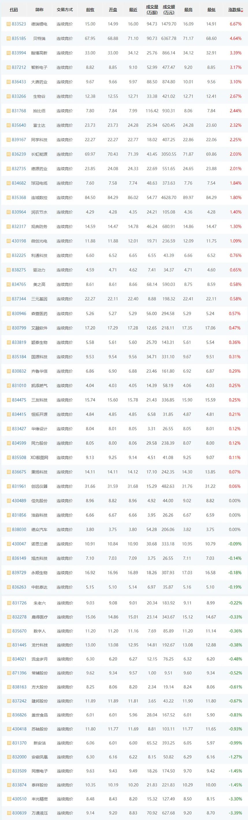 7月7日,精选层涨跌互现,33家企业上涨,3家平盘,20家下跌。其中,德瑞锂电(833523)上市首日涨幅居首,上涨6.67%;其次,贝特瑞(835185)上涨4.64%;万通液压(830839)跌幅居首,下跌3.39%;丰光精密(430510)居次下跌3.30%;佳先股份(430489)、浩淼科技(831856)等平盘。