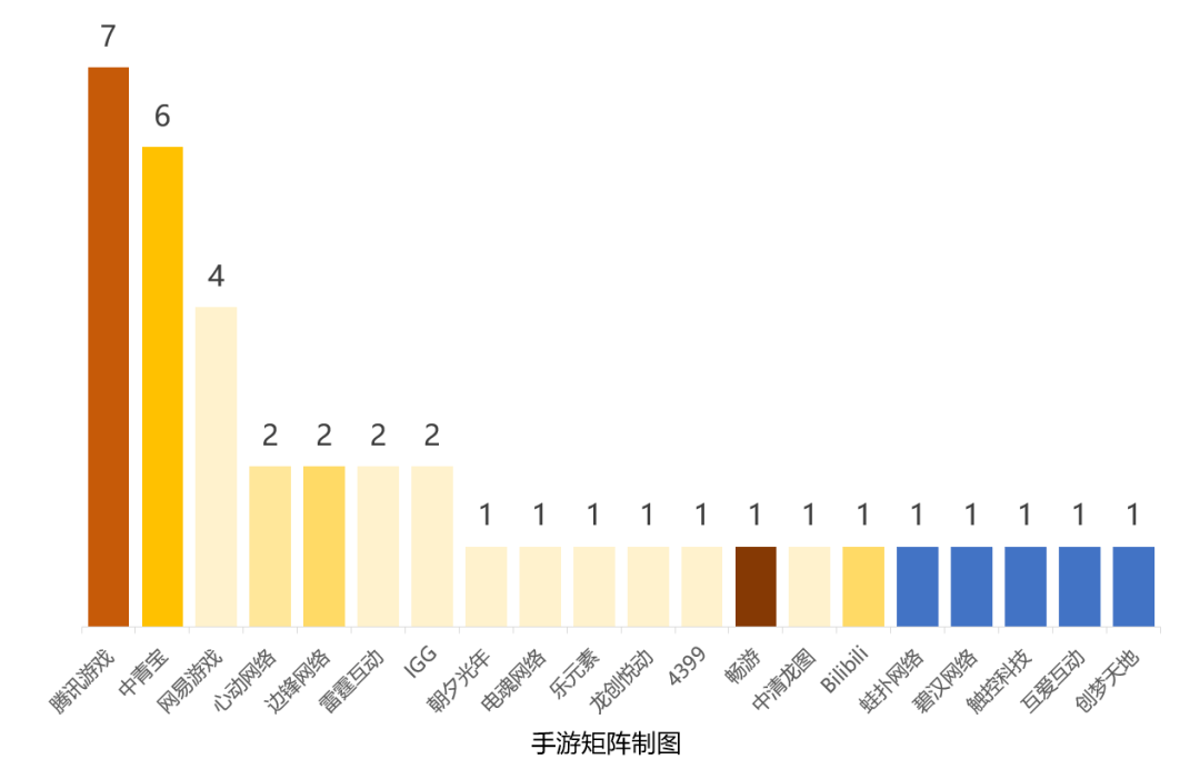 19家“上市&拟上市潜力公司”共有38款游戏过审,其中腾讯过审游戏数量最多,为7款,需要注意的是《暗区突围》和《迷你地铁》所显示的运营单位均为“上海纳原信息技术有限公司”,该公司为腾讯的全资子公司,两款游戏都由腾讯进行代理发行。