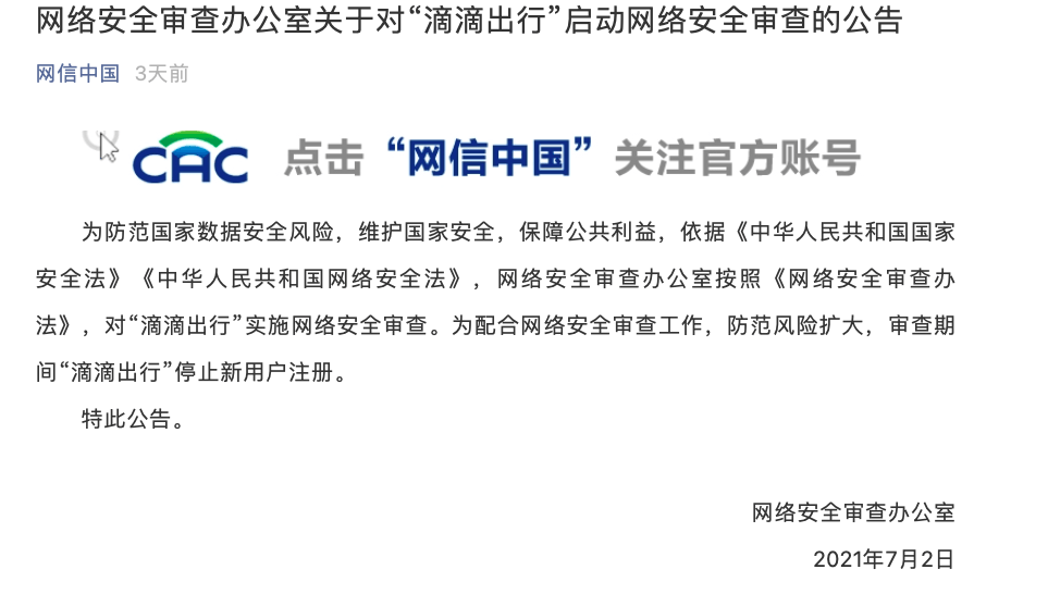 7月2日,刚刚上市2天的滴滴就爆出被网络安全审查办公室审查的消息,并被检测核实存在严重违法违规收集使用个人信息问题。