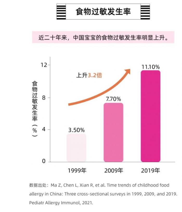 过敏性疾病已被世界卫生组织列为21世纪重点防护的疾病之一。据统计,目前全球约有30%-40%的人口深受过敏性疾病困扰,预计到2050年,患病人数将达到40亿。而在中国,近年来婴幼儿食物过敏人数正呈不断上升趋势。