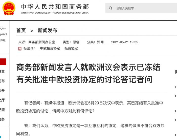 欧洲议会在5月20日的决议中表示,其已冻结有关批准中欧投资协定的讨论。商务部新闻发言人曾就此发表答记者问称,中欧投资协定是一项互惠互利的协定,这样的做法不符合双方共同利益。