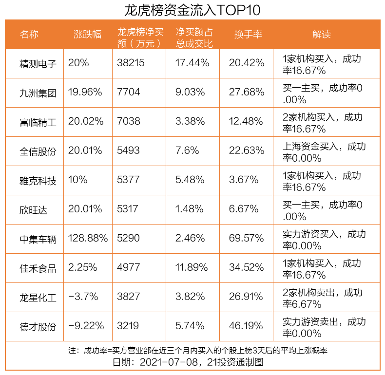 7月8日,上证指数下跌0.79%,深证成指下跌0.38%,创业板指上涨0.69%。盘后龙虎榜数据显示,共有43只个股因当日异动登上龙虎榜,资金净流入最多的是精测电子(300567.SZ),达3.82亿元。