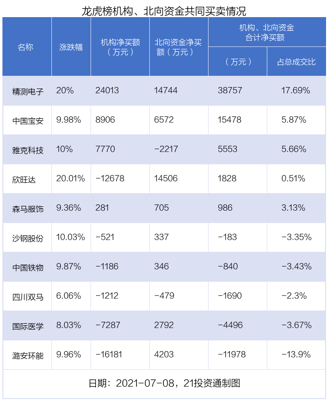 值得注意的是,机构和北向资金共同净买入了精测电子、中国宝安、森马服饰等3股;共同净卖出了四川双马;在欣旺达,潞安环能,国际医学,中国铁物,沙钢股份,雅克科技上出现分歧,机构净卖出欣旺达1.27亿元,北向资金净买入1.45亿元;机构净卖出潞安环能1.62亿元,北向资金净买入4202.63万元;机构净卖出国际医学7287.37万元,北向资金净买入2791.51万元;机构净卖出中国铁物1185.91万元,北向资金净买入345.79万元;机构净卖出沙钢股份520.5万元,北向资金净买入337.49万元;机构净买入雅克科技7770.41万元,北向资金净卖出2217.45万元。