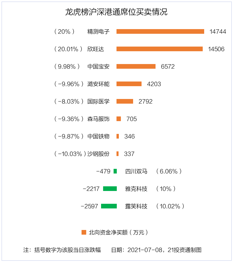 7月8日,北向资金参与龙虎榜中的个股共有11只,合计净买入3.89亿元。其中沪股通净买入1 股,合计净买入4202.63万元;深股通净买入7 股,净卖出3 股,合计净买入3.47亿元。