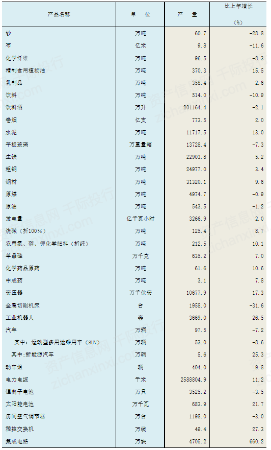 规模以上工业中,农副食品加工业增加值增长9.9%,石油、煤炭及其他燃料加工业下降3.1%,非金属矿物制品业增长5.0%,黑色金属冶炼和压延加工业增长9.8%,医药制造业增长14.1%,专用设备制造业增长0.1%,汽车制造业增长0.8%,计算机、通信和其他电子设备制造业增长10.7%。
