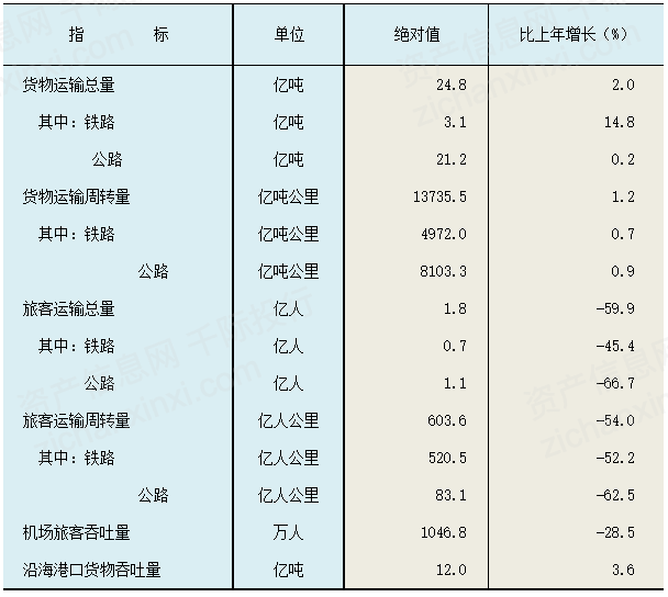 全年货物运输总量24.8亿吨,比上年增长2.0%;货物周转量13735.5亿吨公里,增长1.2%。旅客运输总量1.8亿人,下降59.9%;旅客运输周转量603.6亿人公里,下降54.0%。机场旅客吞吐量1046.8万人,下降28.5%。沿海港口货物吞吐量12.0亿吨,增长3.6%;沿海港口集装箱吞吐量446.8万标准箱,增长8.3%。全省公路通车里程20.5万公里(包括村路),比上年增长4.0%。其中,新增高速公路333公里,高速公路通车里程达到7809公里;农村公路总里程达17.7万公里(包括专用公路)。