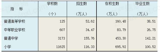 全年研究生教育招生2.53万人,比上年增长25.5%;在学研究生6.41万人,增长16.1%;毕业生1.59万人,增长14.7%。普通高等学校125所,招生52.62万人,增长5.3%;在校生160.48万人,增长8.9%;毕业生38.51万人,增长7.6%。中等职业学校在校生83.79万人,普通中学在校生453.30万人,小学在校生695.92万人,幼儿园在园幼儿245.31万人。九年义务教育巩固率为97.63%,高中阶段毛入学率为94.14%。