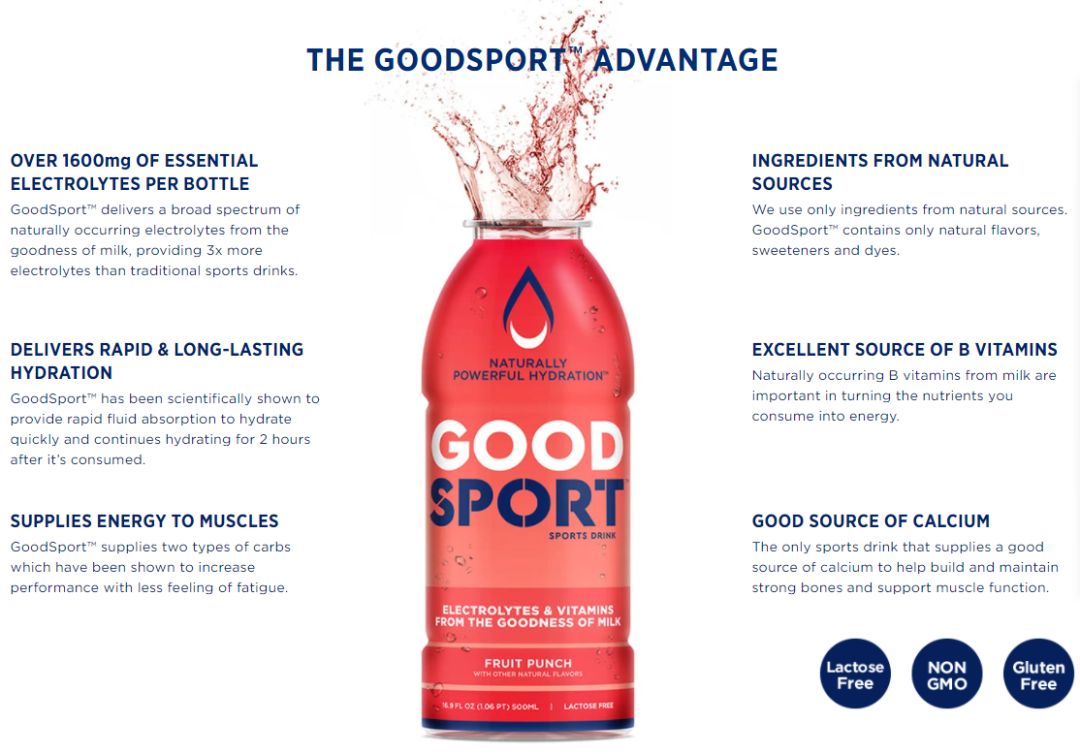 之后,McBride开始尝试用巧克力牛奶代替传统运动饮料给儿子进行水分补充。但她很快发现,牛奶的补水效果虽好,但由于其蛋白质、脂肪含量高,口感黏稠浓厚,不易消化,缺少运动饮料必备的清爽感。终于,McBride萌生了创立GoodSport的想法,准备研发一款基于牛奶的,真正天然健康的补水运动饮料。