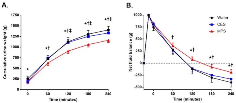 摄入三种饮料后的尿液累积量及净液体平衡状况。图片来源:Nutrients