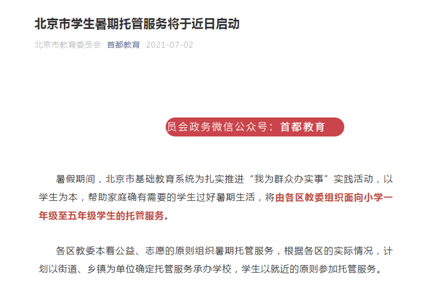 为解决学生暑期“看护难”问题,日前教育部印发了《关于支持探索开展暑期托管服务的通知》,引导支持有条件的地方积极探索开展暑期托管服务工作。