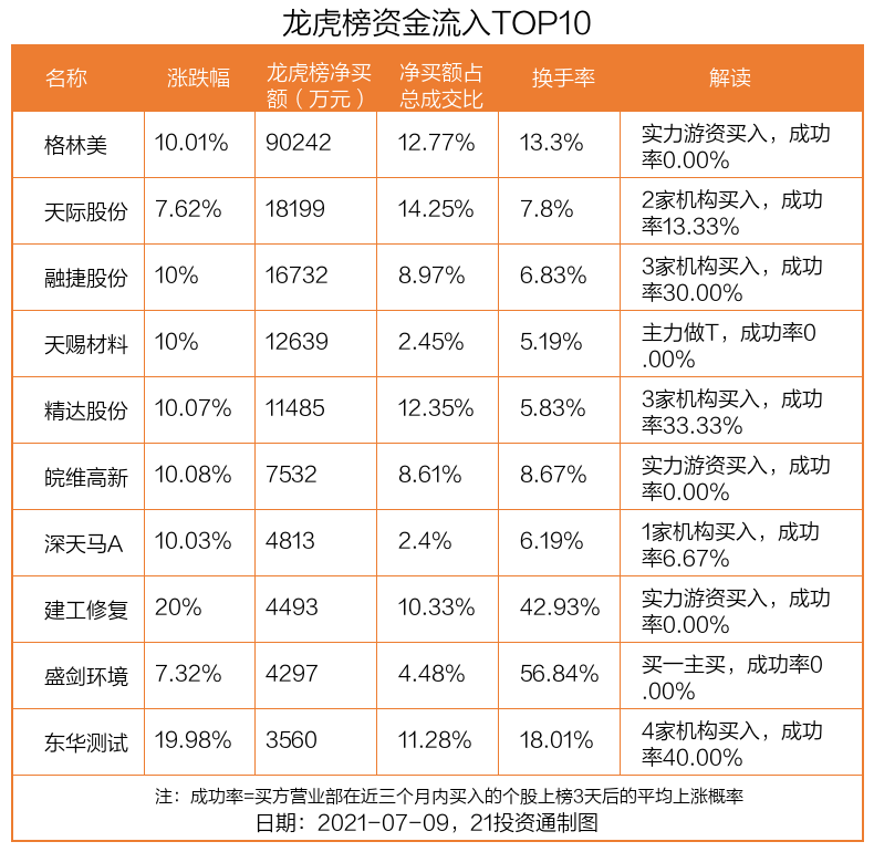 7月9日,上证指数下跌0.04%,深证成指下跌0.26%,创业板指下跌0.69%。盘后龙虎榜数据显示,共有37只个股因当日异动登上龙虎榜,资金净流入最多的是格林美(002340.SZ),达9.02亿元。