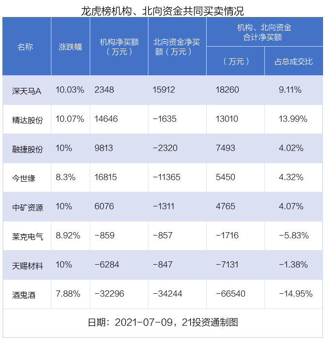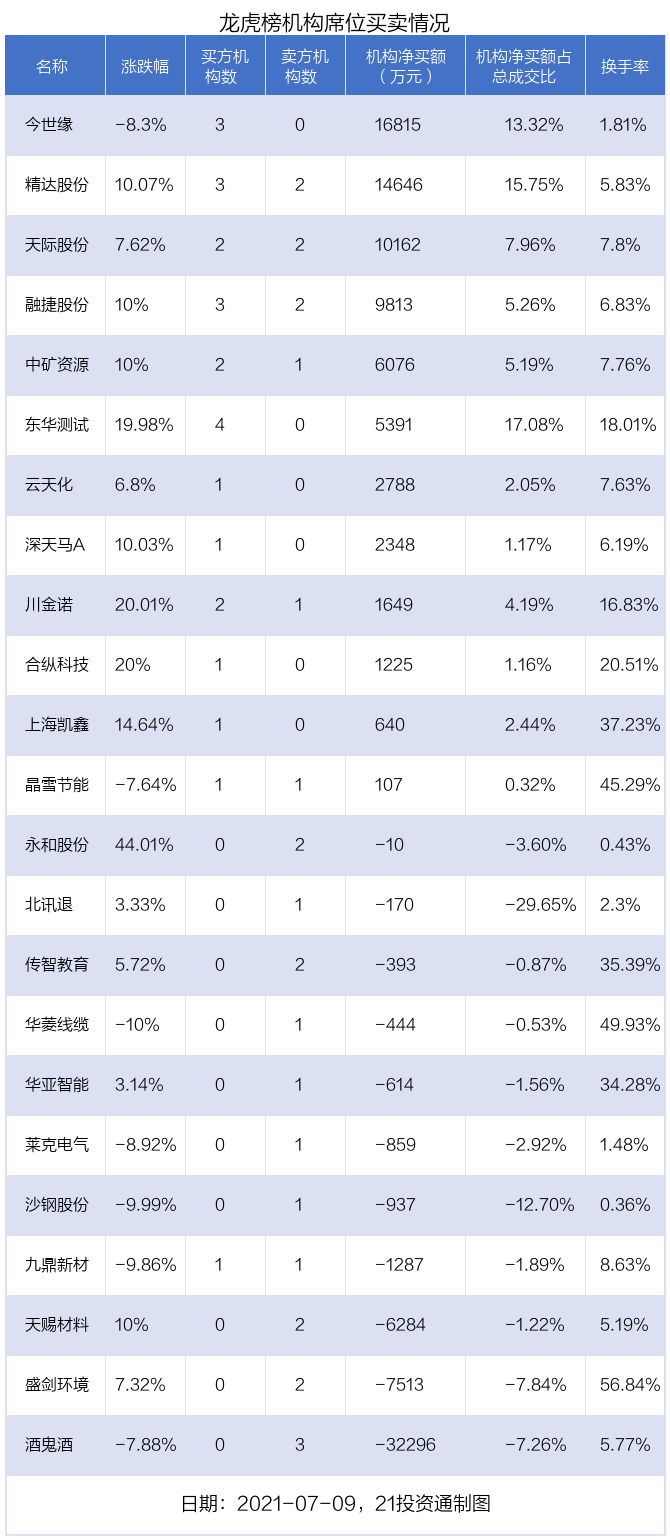 7月9日,23只个股龙虎榜出现了机构的身影,机构合计净买入2.09亿元。具体来看,机构净买入12股,净卖出11股。