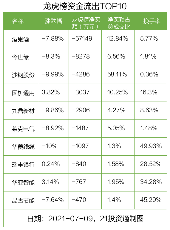 7月9日,北向资金参与龙虎榜中的个股共有9只,合计净卖出1.53亿元。其中沪股通净卖出3 股,合计净卖出1.39亿元;深股通净买入2 股,净卖出4 股,合计净卖出1404.1万元。