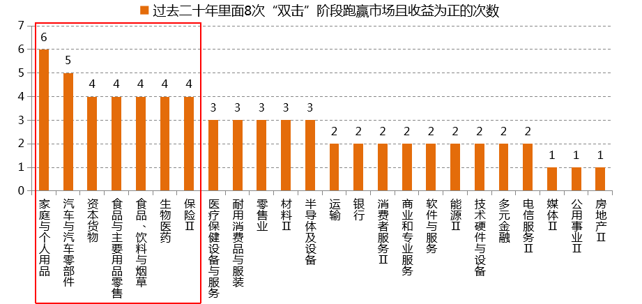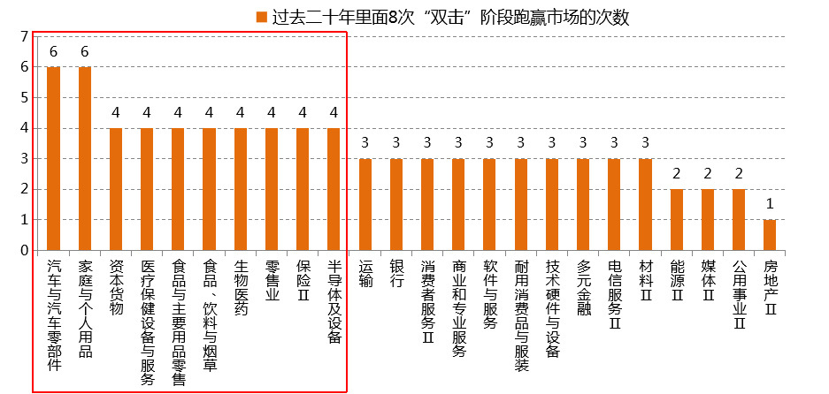 数据显示,汽车与零配件、家庭与个人用品两个板块在6次“双击”行情中跑赢市场主流宽基指数;而医疗保健、食品与主要零售用品、食品饮料、生物医药、保险、半导体等均有4次跑赢市场。