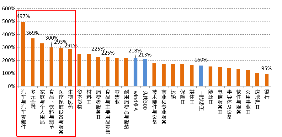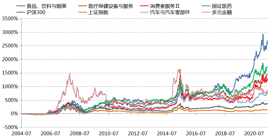 结果显示,过去十七年里,食品饮料从2004年7月以来涨幅高达26倍,同期,医药指数上涨超17倍,医疗设备上涨超14倍,消费者服务上涨超12倍,汽车与零配件、多元金融均上涨8倍左右。这些强势板块都明显好于沪深300同期3.7倍、上证指数1.5倍的表现。