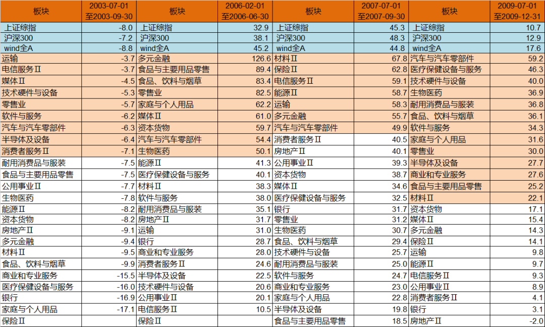 有两次上证指数、沪深300、wind全A等市场主流宽基指数是下跌的,一次是2003年7月至2003年9月,Wind三级行业来看,这个阶段所有板块都是下跌的;另一次是2019年5-6月,多数板块在贸易摩擦冲击下收低。