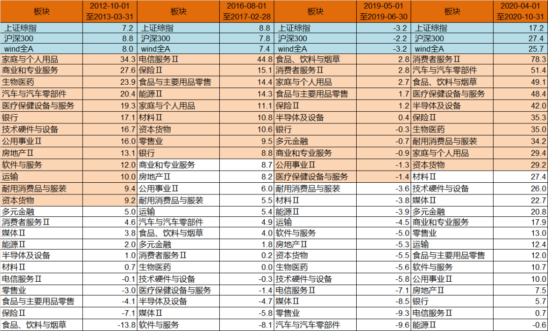 家庭与个人用品板块,有6次;汽车与零配件有5次,食品与主要用品零售、食品饮料、生物医药、保险等均有4次正收益且跑赢市场的记录。而媒体、公用事业、房地产均只有1次。