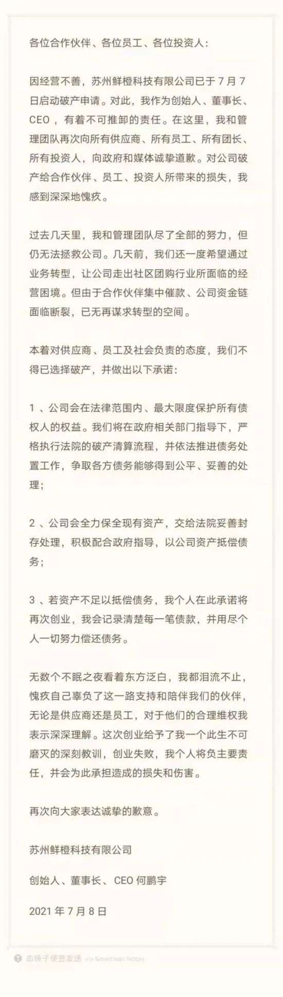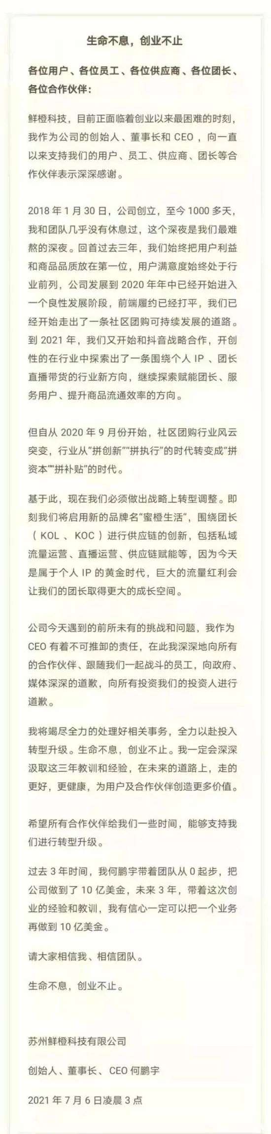 时间回到同程生活破产的前一天,同程生活创始人兼CEO何鹏宇发布一封公开信,引起供应商热议。信中表示,鲜橙科技目前正面临着创业以来最困难的时刻。自从2020年9月开始,社区社区团购行业风云突变,行业从“拼创新”“拼执行”的时代转变成“拼资本”“拼补贴”的时代。基于此,现在鲜橙科技必须在业务上做出调整。
