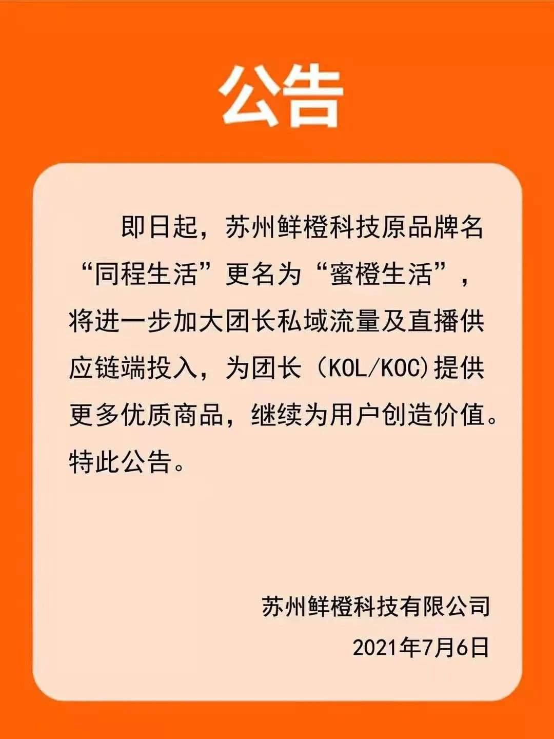 而何鹏宇所提到的调整,就是启用新的品牌名,将“同程生活”正式更名为“蜜橙生活”。围绕团长(KOL、KOC)进行供应链的创新,包括私域流量运营、直播运营、供应链赋能等。