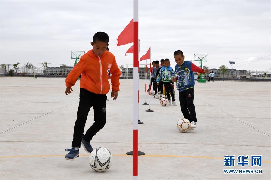在甘肃武威市古浪县黄花滩生态移民区富民新村富民小学,足球兴趣小组的孩子们开展训练(2019年8月22日摄)。新华社记者 范培珅 摄