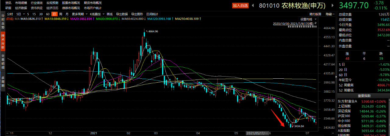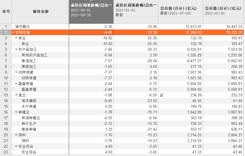 A股早盘下挫后回升,最后微跌。农林牧渔板块尾盘回升,但仍收跌。回顾6月行情,该板块6月7日至6月21日连续10日收跌,累计跌幅近10%。