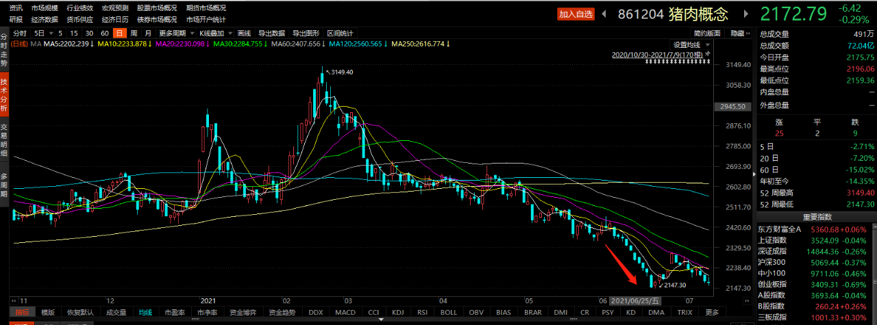 6月7日至6月21日连续收跌的还有猪肉概念指数,10日累计下跌11.68%。