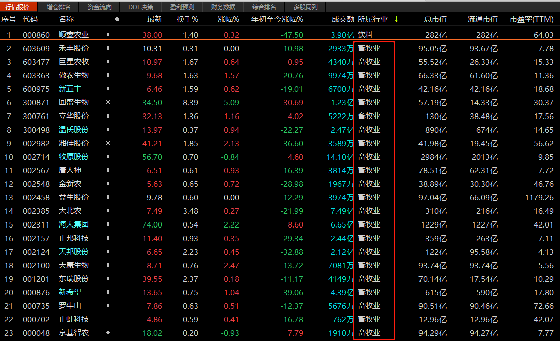 就个股而言,36只猪肉概念股中,年内上涨的共计8只,牧原股份、海大集团涨幅均超过4%,最新市盈率(TTM)分别是9.85倍、42.01倍。而双汇发展、温氏股份、新希望、正邦科技等股票年内跌幅均大于20%。