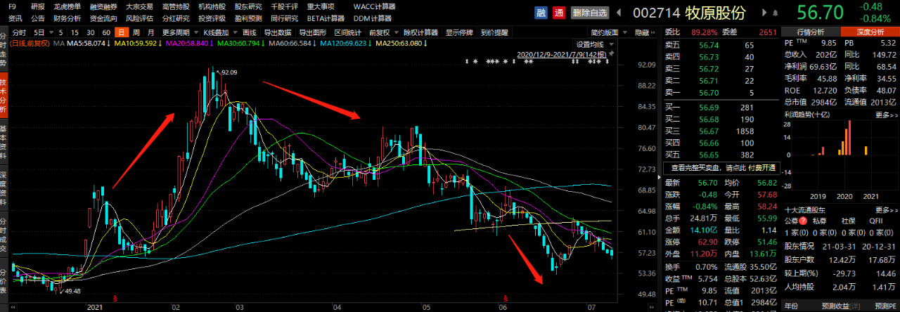 在年初资金“抱团”浪潮中,大市值牧原股份股价“被宠上天”,一度攀升至92.09元/股,之后大幅回调,4月至5月行情以震荡态势为主,之后震荡下挫,6月10日至6月22日持续8日收跌,期间累计下跌16.31%。之后略微反弹再下跌,今日收跌0.84%报56.7元。