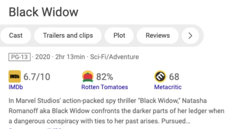 做为漫威电影宇宙(MCU)第四阶段的首部作品,《黑寡妇》的开局表现至关重要。截至7月9日,该片Metacritic评分68,烂番茄新鲜度82%,IMDb6.7,在漫威电影中并不算出彩。公映延期,口碑平平,叠加流媒体资源的影响,对《黑寡妇》来说意味着数亿人民币甚至上亿美元的票房损失。