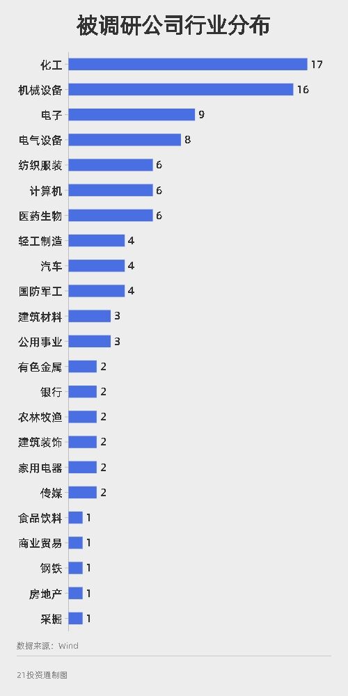 从行业分布来看,化工行业最受机构青睐,有17家公司获调研,包括云图控股(002539.SZ)、沧州明珠(002108.SZ)等;机械设备行业紧随其后,有16家公司获调研。其次是电子和电气设备,分别有9家和8家公司获调研。