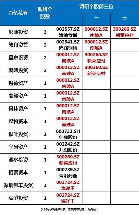 其中,敦和资管、高毅资产等8家百亿私募机构调研了南玻A(000012.SZ)。彤源投资等4家百亿私募调研了新莱应材(300260.SZ)。海洋王(002724.SZ)则收到了泓澄投资和深圳凯丰投资的共同关注。