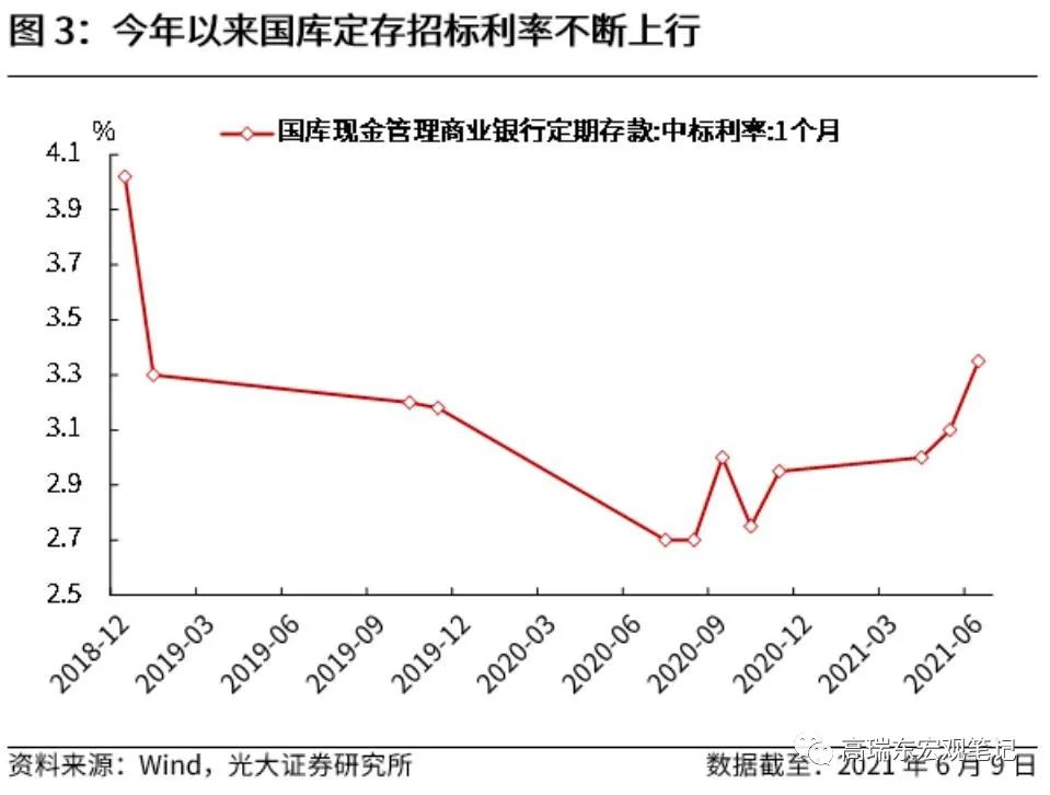 三则,今年以来国库定存招标利率不断上行,反映出商业银行体系,尤其是中小银行存款负债压力较大。可以观察到,今年以来的三次国库定存招标利率分别是3.00%、3.10%与3.35%,招标利率逐次上行。国库现金定存招标是财政部通过招标的方式将国库现金存到商业银行,商业银行以国债或地方政府债券为质押获得存款并向财政部支付利息的交易行为。国库定存招标的中标利率主要受银行(尤其是中小银行)的存款负债压力影响。今年以来国库定存招标利率逐次上行反映出中小银行吸收一般存款的压力日益增大,以及持续高增的政府存款对商业银行存款负债形成挤压。