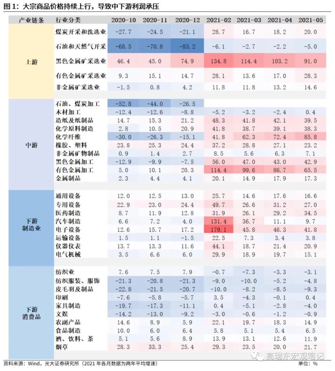 二则,对于下游消费品行业,成本压力不断加大,利润复苏相对缓慢。从服装、家具类下游消费品行业来看,利润复苏相对较慢,2021年1-5月,纺织业、纺织服装、家具制造业利润两年平均分别同比增长-3.1%、-4.8%、-4.0%,两年平均增速持续为负,成本压力不断加大,仍未恢复到疫情前同期水平。