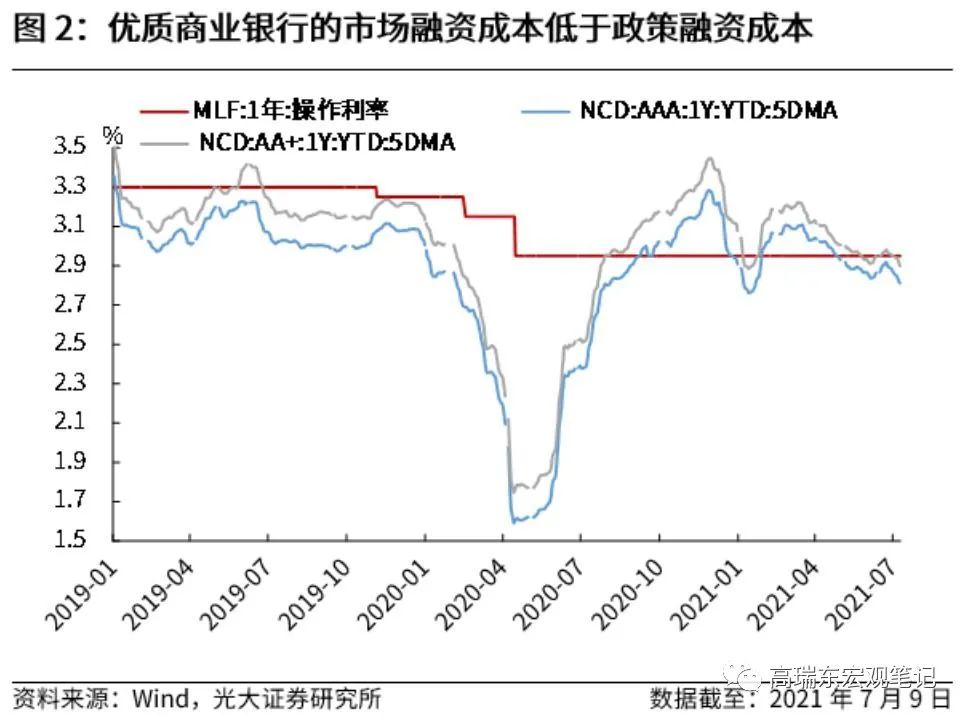 一则,三季度有1.70万亿MLF到期,但目前银行负债端的市场融资成本甚至低于MLF利率,降准置换MLF降低了商业银行的边际负债成本。通过梳理央行公开市场操作,可以看到,三季度将会有1.70万亿元MLF到期,四季度仍有2.45万亿元MLF到期。如果通过续作MLF的方式保证商业银行的长期流动性,我们会发现,现在MLF的操作利率要高于1年期同业存单的收益率,在提高商业银行边际负债成本的同时,与希望商业银行降低贷款利率似乎有些南辕北辙。而通过降准置换MLF的方式,则可以用低成本的法定准备金来置换高成本的MLF,降低了商业银行的边际负债成本,进而推动实体经济融资利率下行。