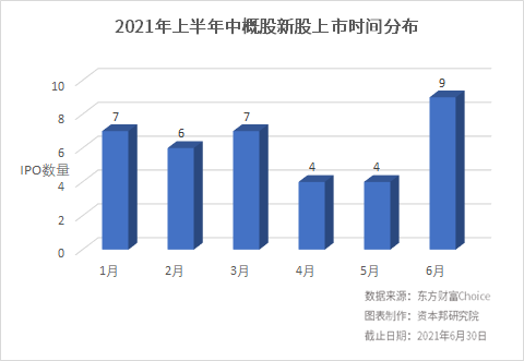 2021年1-3月,中概股在美股上市的数量较为均匀,分别为7、6和7家。