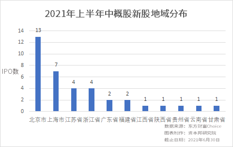 2021年上半年,北京和上海成为前两大新股诞生地,分别有13家和7家中概股成功在美股上市。江苏省和浙江省并列第三,均有4家。广东省和福建省各有2家中国企业在美股上市。