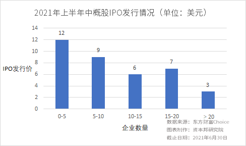 从IPO发行价来看,发行价在0-5美元的中概股数量最多,达12家。其次为5-10美元,有9家。