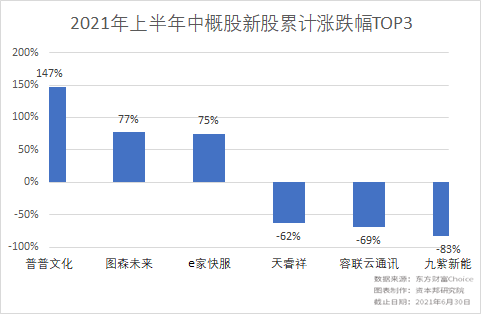 截至2021年6月30日,于6月底上市的普普文化股价涨幅最高,为147%。在4月上市的图森未来位列第二,达77%。E家快服的股价涨幅略低于图森未来,为75%。