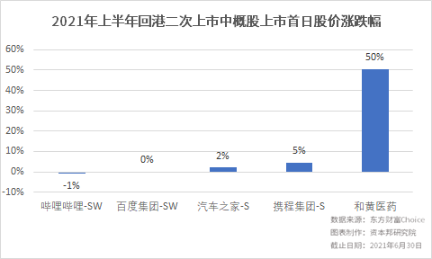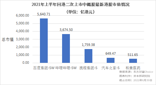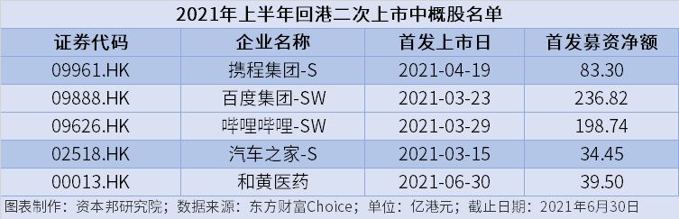 面对美股市场中的不确定风险以及港股市场中概股回归的政策利好,今年以来,中概股回港上市的热情仍在延续,截至6月30日,共有5家中概股成功在港股上市,具体为携程集团、哔哩哔哩、百度集团、汽车之家以及和黄医药。